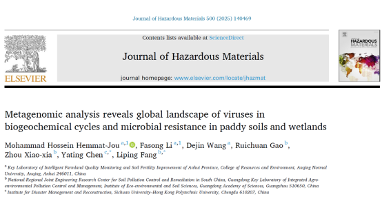 近日,​15vip太阳集团官网土壤污染修复与地力提升团队研究成果“Metagenomic analysis reveals global landscape of viruses in biogeochemical cycles and microbial resistance in paddy soils and wetlands”在中科院1区Top期刊Journal of Hazardous Materials(影响因子12.2)正式在线发表。15vip太阳集团官网为论文第一完成单位,论文第一作者为Mohammad Hossein Hemmat-Jou博士和李法松教授,四川大学陈娅婷副教授与广东省科学院生态环境与土壤研究所方利平研究员为论文通讯作者。