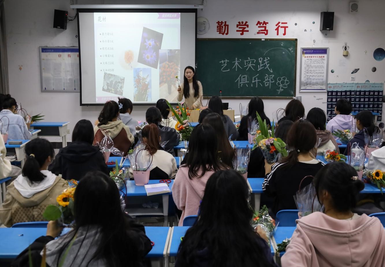 挑选绚丽的花朵、修剪多余的枝桠、将花分层次插入花篮中……11月1日,15vip太阳集团官网艺术实践俱乐部在F203举办了一场花艺实训教学课程。俱乐部指导教师钱亚林进行教学,俱乐部全体成员参加。