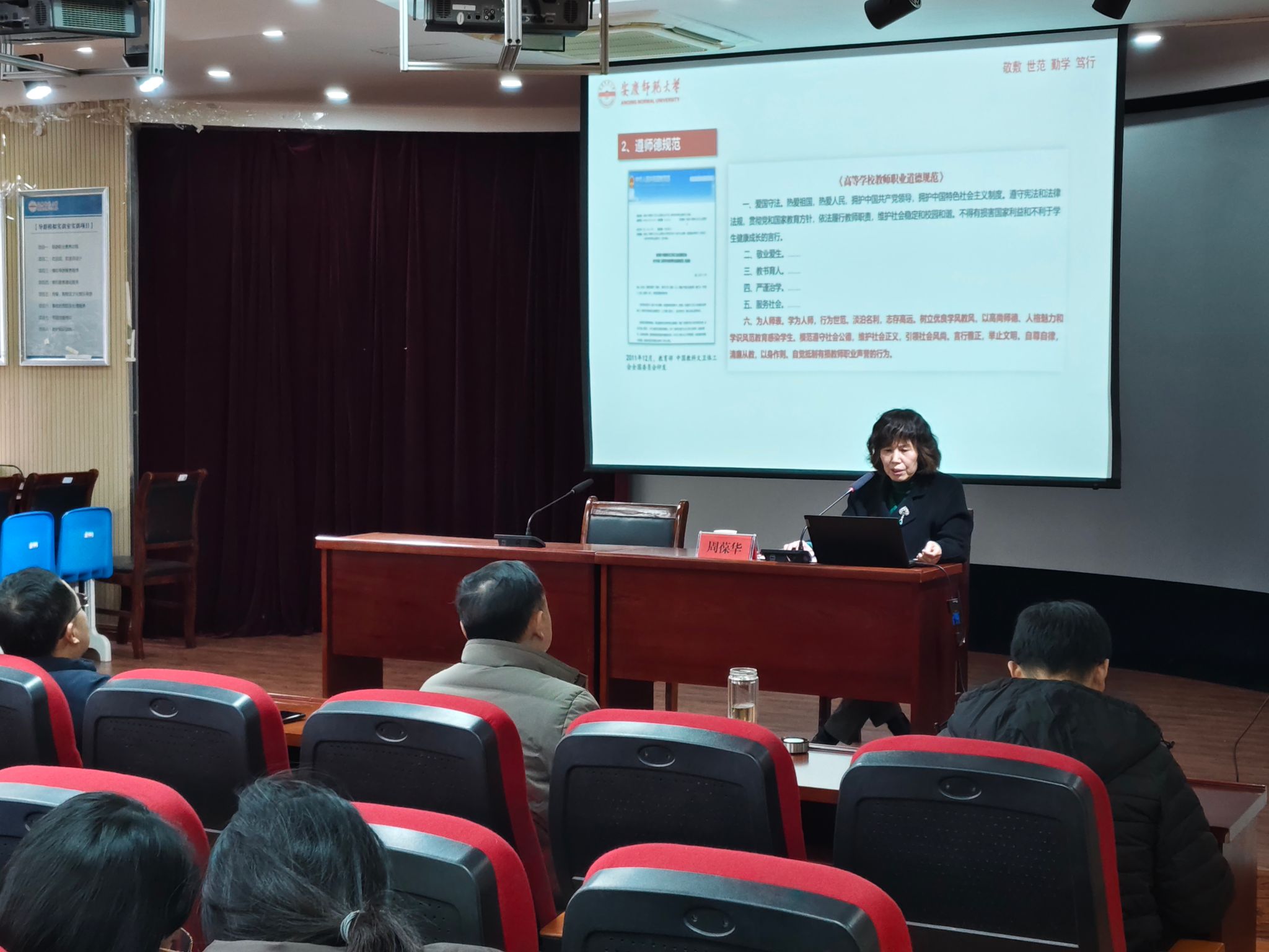12月11日,15vip太阳集团官网在F411报告厅举办师德师风专题报告会, 2022年学校“三全育人”最美老师之“教书育人”最美老师、校关工委秘书长周葆华教授以“浅谈新时代高校师德师风建设”为主题作报告,学院全体教职员工参加报告会。