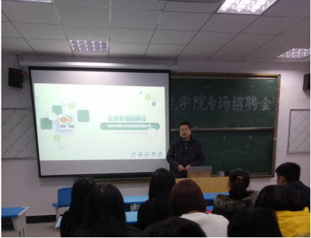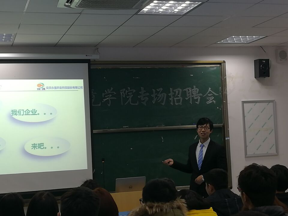 安庆永强农业科技股份有限公司成立于2000年,系“新三板”上市企业,拥有资产数亿元,是集农、科、贸为一体的省级农业化龙头企业。该公司人力资源主管李博从就业指导、职场心态、公司概况等方面进行了宣讲,并与在场的员工就“如何了解一个公司的发展前景”与“如何正确选择自己适合的公司”等问题进行了的交流讨论。