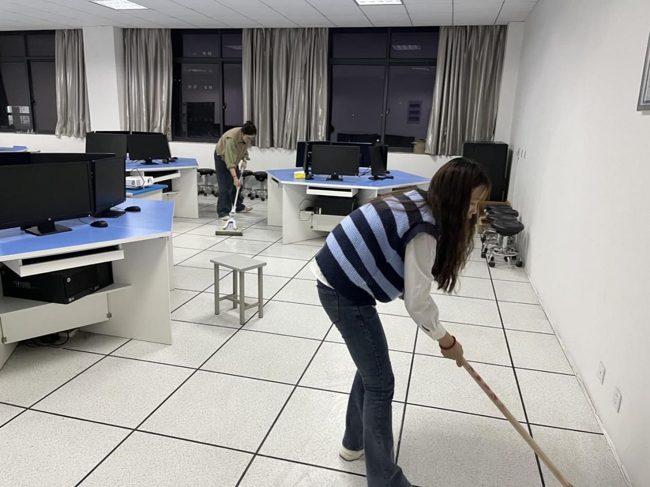 擦拭窗户、清理讲台、扫地拖地、倒垃圾,直至夜幕降临,清扫完最后一间教室的石婷婷才和同伴一起去吃饭。“白天教室里有员工上课,所以我们只能在课后开始打扫。教室是我们除了寝室外最常待的地方,希望通过我们的努力能让大家在干净舒心的环境中学习。”