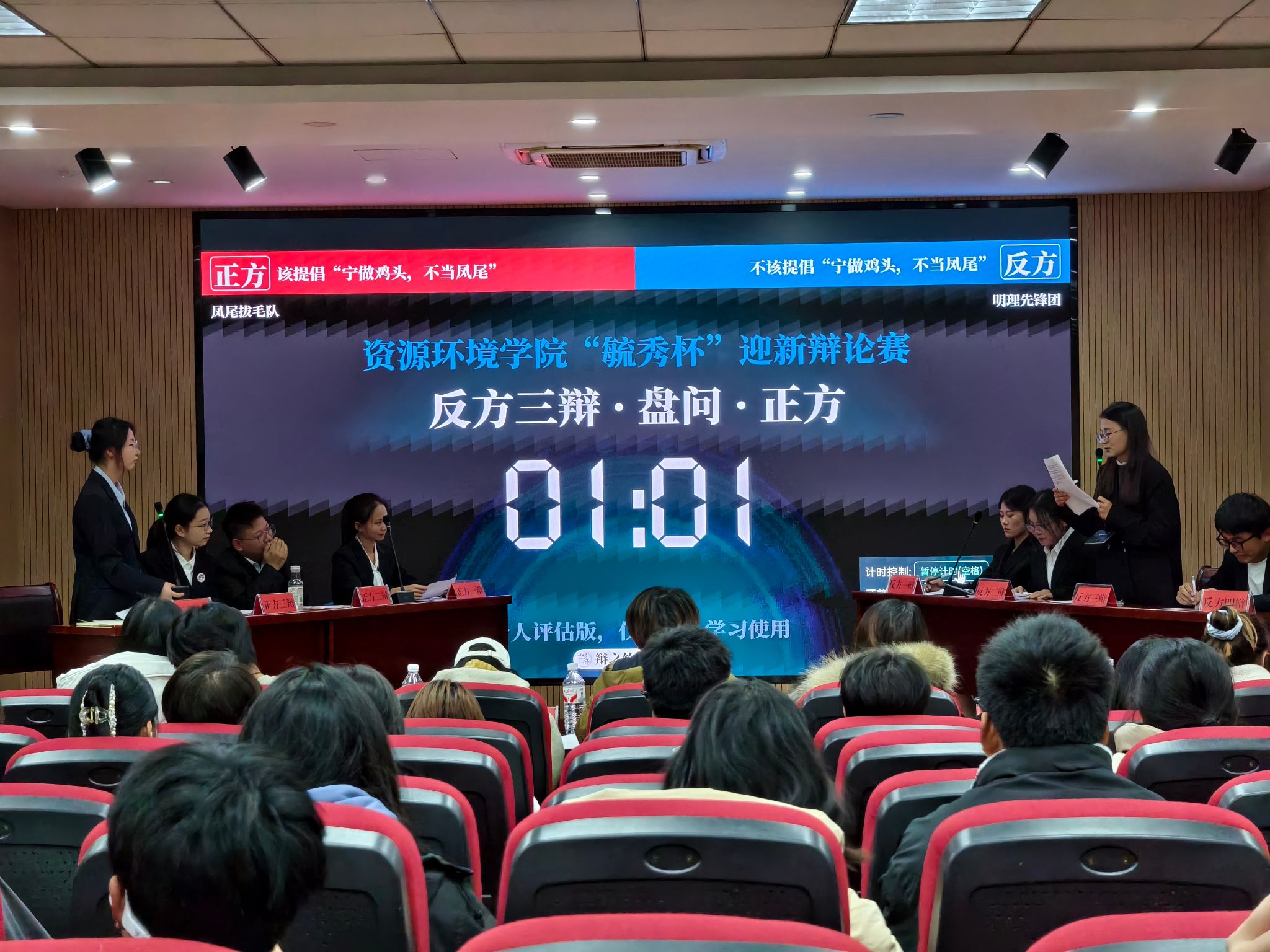 智辩交锋,悟理成长。参赛选手们围绕“是否提倡宁做鸡头,不做凤尾”核心辩题展开深度交锋,反方以“优质平台赋能成长”为切入点,结合实例阐释资源优势与视野拓展的重要性;正方立足“自主能动性驱动发展”,通过严密逻辑论证个人价值实现路径,双方围绕焦点问题多轮攻防,辩手反应敏捷、表达流畅,充分展现新生良好思辨素养与精神风貌。