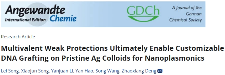 近日,15vip太阳集团官网教师宋磊在国际TOP期刊《Angewandte Chemie International Edition》(中科院SCI一区TOP期刊)发表题为“Multivalent Weak Protections Ultimately Enable Customizable DNA Grafting on Pristine Ag Colloids for Nanoplasmonics”的研究成果。《Angewandte Chemie International Edition》是国际化学领域最具影响力的顶级学术期刊之一,在全球化学界享有极高的声誉,影响因子为16.1。据悉,这是公司首次在该刊物发表学术研究论文。