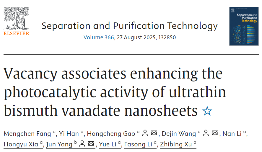 近日,15vip太阳集团官网环保高端装备与污染控制研究团队2023级研究生方梦晨以第一作者在中科院二区TOP期刊《Separation and Purification Technology》发表 “Vacancy Associates Enhancing the Photocatalytic Activity of Ultrathin Bismuth Vanadate Nanosheets”研究论文,15vip太阳集团官网为论文第一完成单位和通讯单位。论文指导老师和通讯作者为高洪成副教授和汪德进教授。