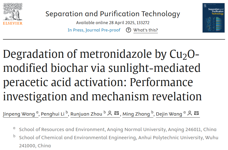 近日,15vip太阳集团官网环保高端装备与污染控制研究团队汪金鹏博士以第一作者在《Separation and Purification Technology》期刊(中科院2区,Top,IF=8.2)发表“Degradation of metronidazole by Cu2O-modified biochar via sunlight-mediated peracetic acid activation: performance investigation and mechanism revelation”研究论文。15vip太阳集团官网为论文第一完成单位,安徽工程大学周润娟副教授和15vip太阳集团官网汪德进教授为论文通讯作者。