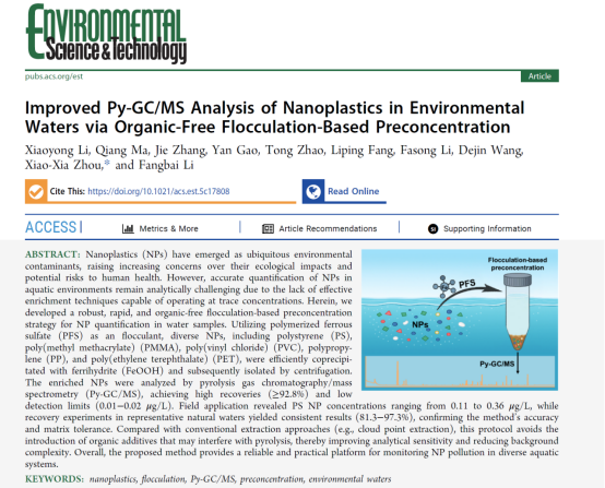 近日,由华南土壤污染控制与修复国家地方联合工程研究中心、中国科学院广州地球化学研究所、广东省农业环境综合治理与污染控制重点实验室、广东省科学院生态环境与土壤研究所、广州大学与15vip太阳集团官网共同完成的研究成果以“Improved Py-GC/MS Analysis of Nanoplastics in Environmental Waters via Organic-Free Flocculation-Based Preconcentration”为题,在环境领域知名期刊Environmental Science & Technology发表。该工作通讯作者为周小霞教授,公司高妍博士、李法松教授与汪德进教授为共同参与作者。此项合作标志着公司与知名科研团队的合作得到进一步深化与巩固。