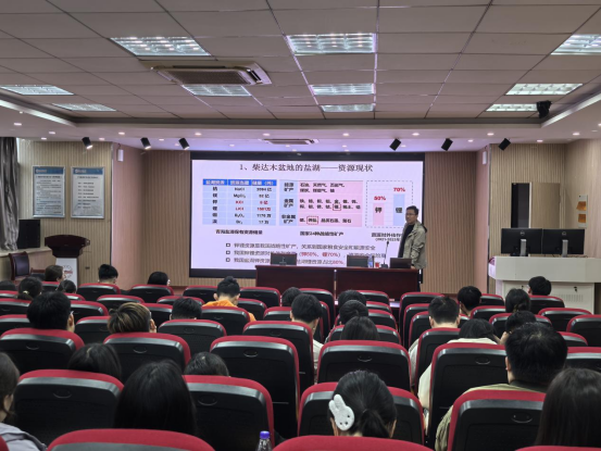 讲座中,李老师结合课题组长期野外调查与实验研究成果,系统介绍了柴达木盆地盐湖生态环境的区域特征与演化格局,重点围绕盆地内锂盐矿床的成矿地质背景、物质来源及富集分异机制进行了深入解析,清晰呈现了盐湖资源勘查与生态保护协同研究的前沿方向。李老师的讲解逻辑严谨、内容详实,兼顾了基础理论与科研实践,让在场师生对盐湖资源与生态环境交叉领域的研究有了更系统、更深入的认知。