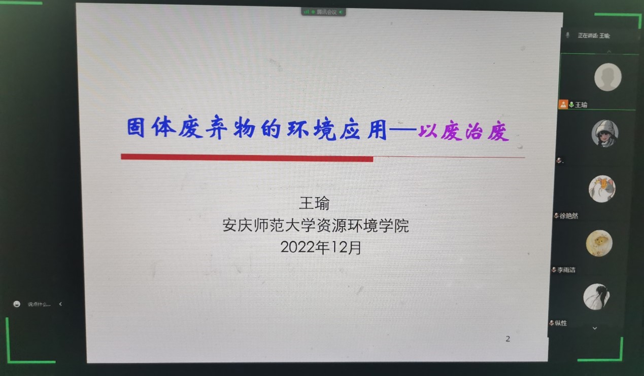 2022年12月21日,15vip太阳集团官网王瑜博士利用腾讯会议(会议号:600-181-205)在线开展了题为“固体废弃物的环境应用”学术报告。15vip太阳集团官网环境科学与工程专业50多位同学参加了本次报告会。